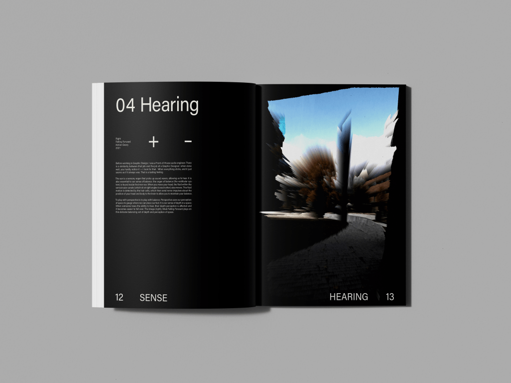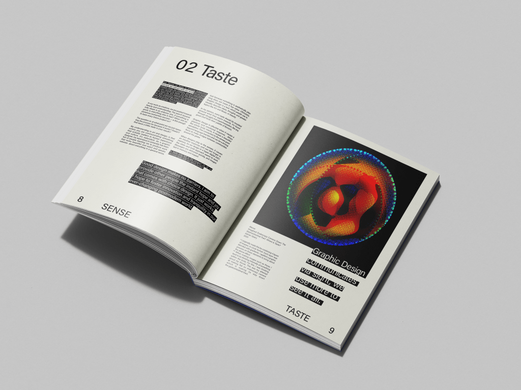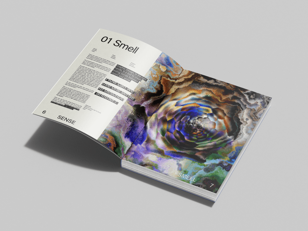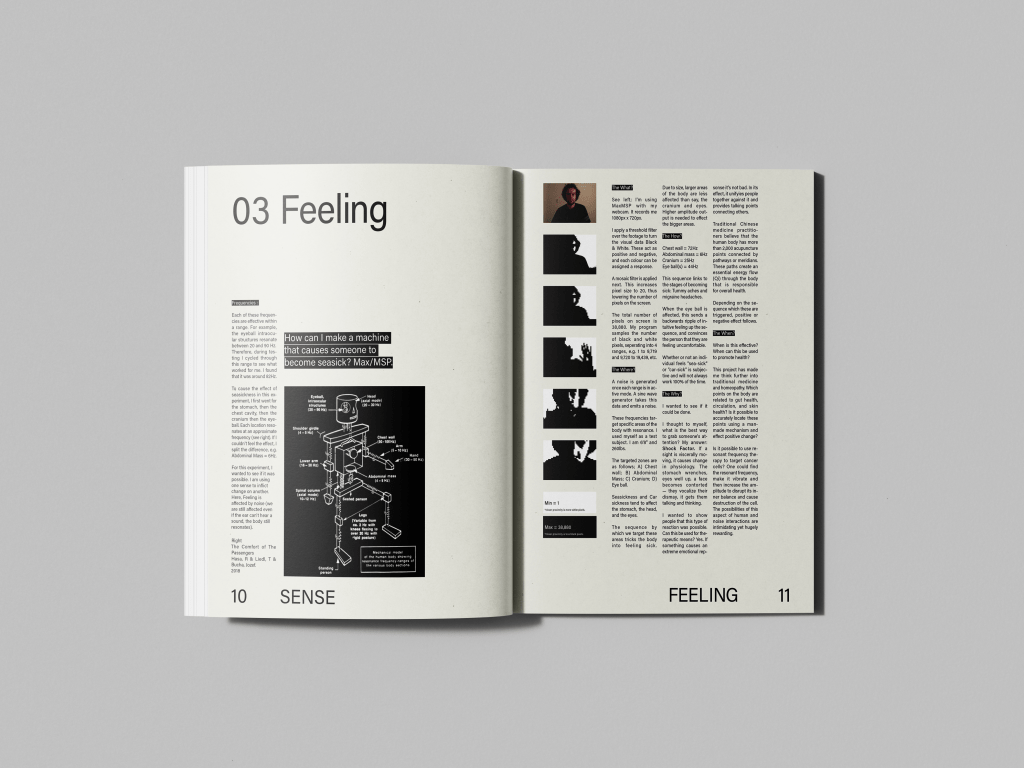 This project encompasses my final year in OCAD University, graduating in the year 2021. It covers several projects related to the human body, to robotics, sound frequency and resonance, the effect on the body, and human experience. Each spread is related to a sensory feeling including; sight, hearing, touch, smell, and taste.