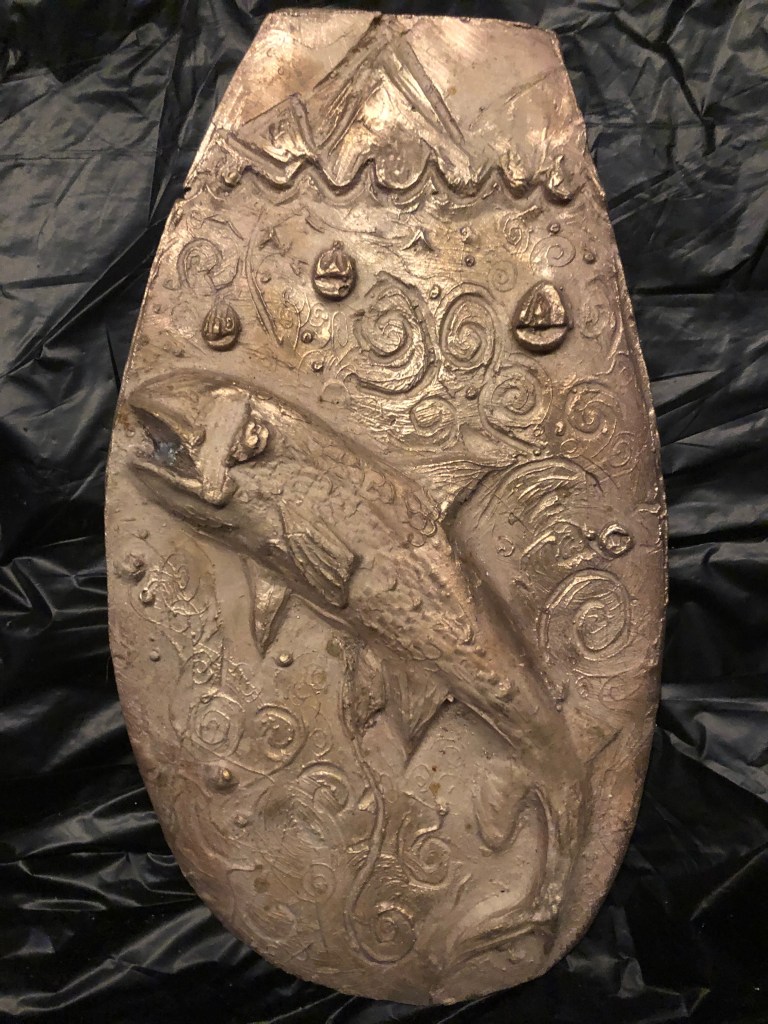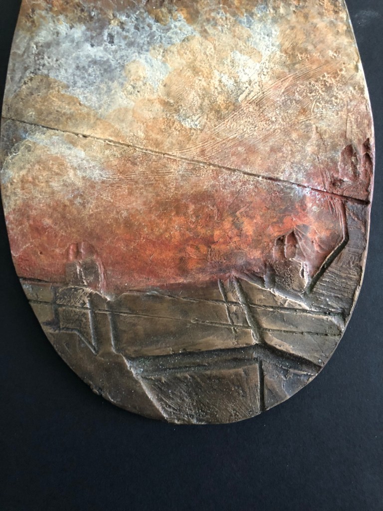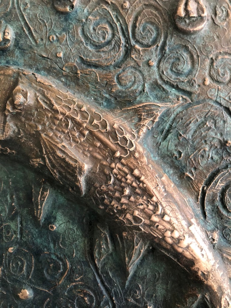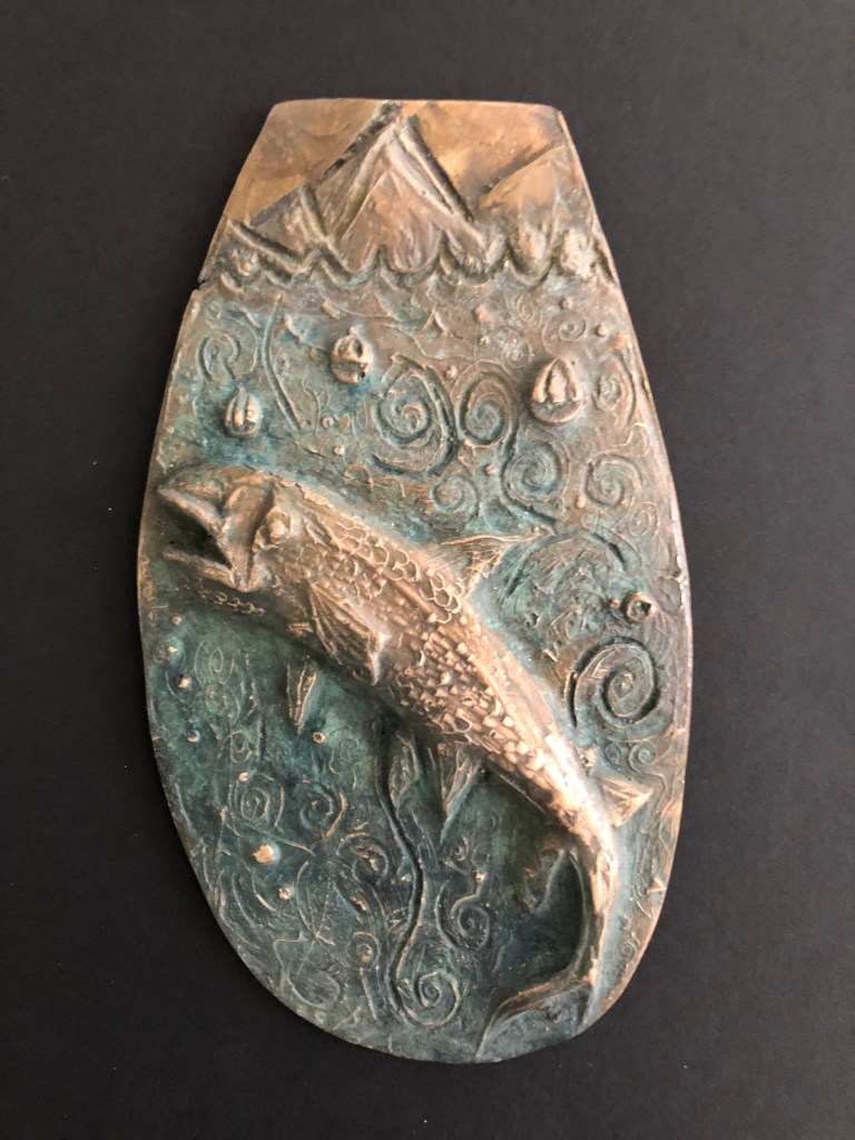 My intention is to showcase Irish culture both in its modern context and in the timeless, classical sense. Each bronze plate symbolizes a distinct facet of our land and culture: Sky, Water, Earth. The Sky plate features the iconic chimney stacks of inner Dublin, set against a vibrant sunset, with birds in the background. This work offers a contemporary interpretation of Dublin. The middle bronze plate represents Water, life, and new beginnings. Inspired by the classic Irish folktale of the Salmon of Knowledge, it symbolises the transformative journey of the fish, moving boldly upwards and forwards. The final bronze represents the Earth. I have inlaid actual textures of branches and leaves into the original sculpture, creating a maze of intersecting lines, bridges, and textures. This bronze reflects ancient Ireland – a time of stone, forests, and the refuge found in caves, where the roots of our culture began to form.