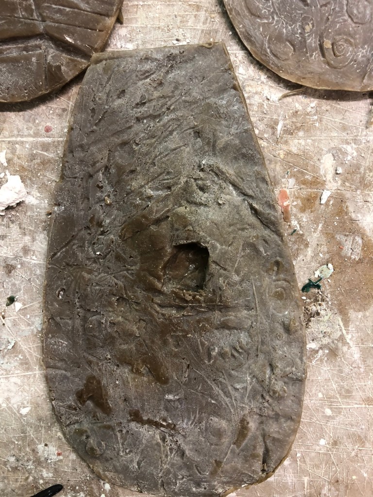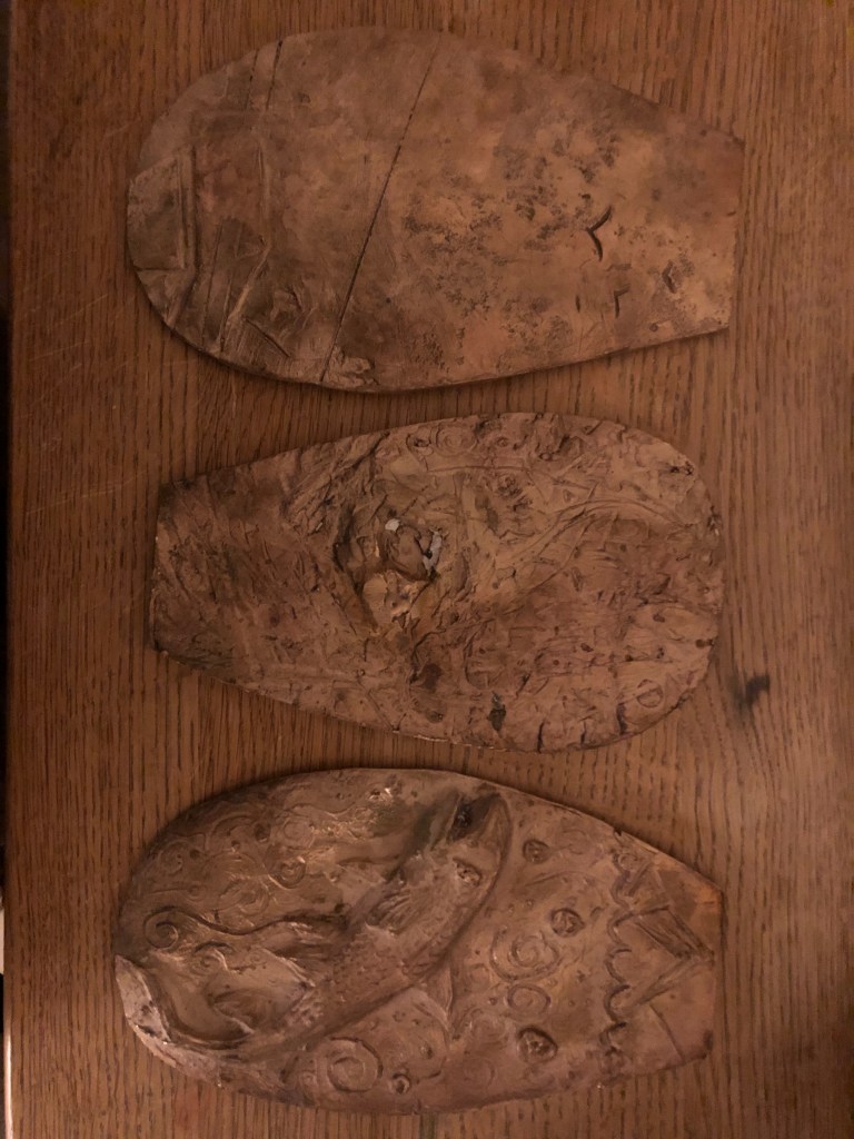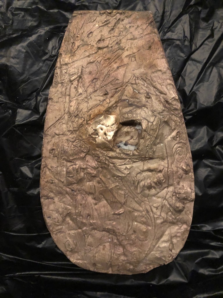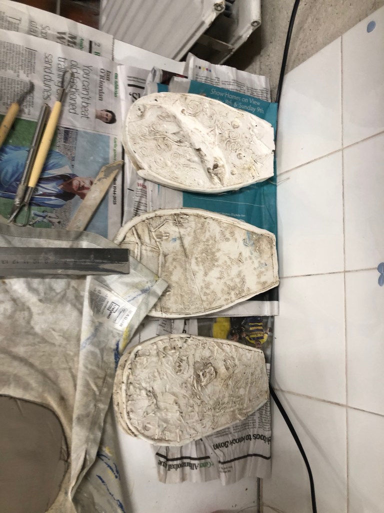 My intention is to showcase Irish culture both in its modern context and in the timeless, classical sense. Each bronze plate symbolizes a distinct facet of our land and culture: Sky, Water, Earth. The Sky plate features the iconic chimney stacks of inner Dublin, set against a vibrant sunset, with birds in the background. This work offers a contemporary interpretation of Dublin. The middle bronze plate represents Water, life, and new beginnings. Inspired by the classic Irish folktale of the Salmon of Knowledge, it symbolises the transformative journey of the fish, moving boldly upwards and forwards. The final bronze represents the Earth. I have inlaid actual textures of branches and leaves into the original sculpture, creating a maze of intersecting lines, bridges, and textures. This bronze reflects ancient Ireland – a time of stone, forests, and the refuge found in caves, where the roots of our culture began to form.