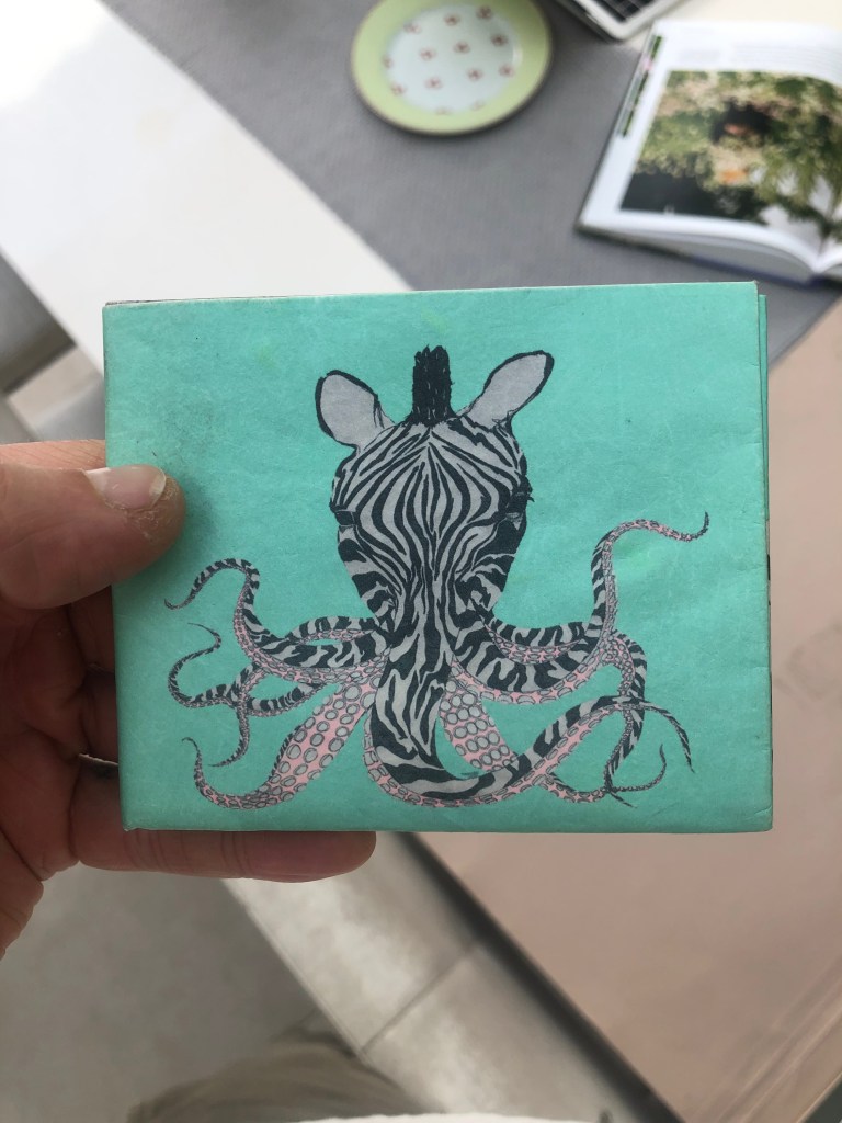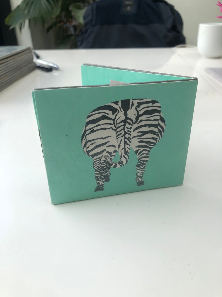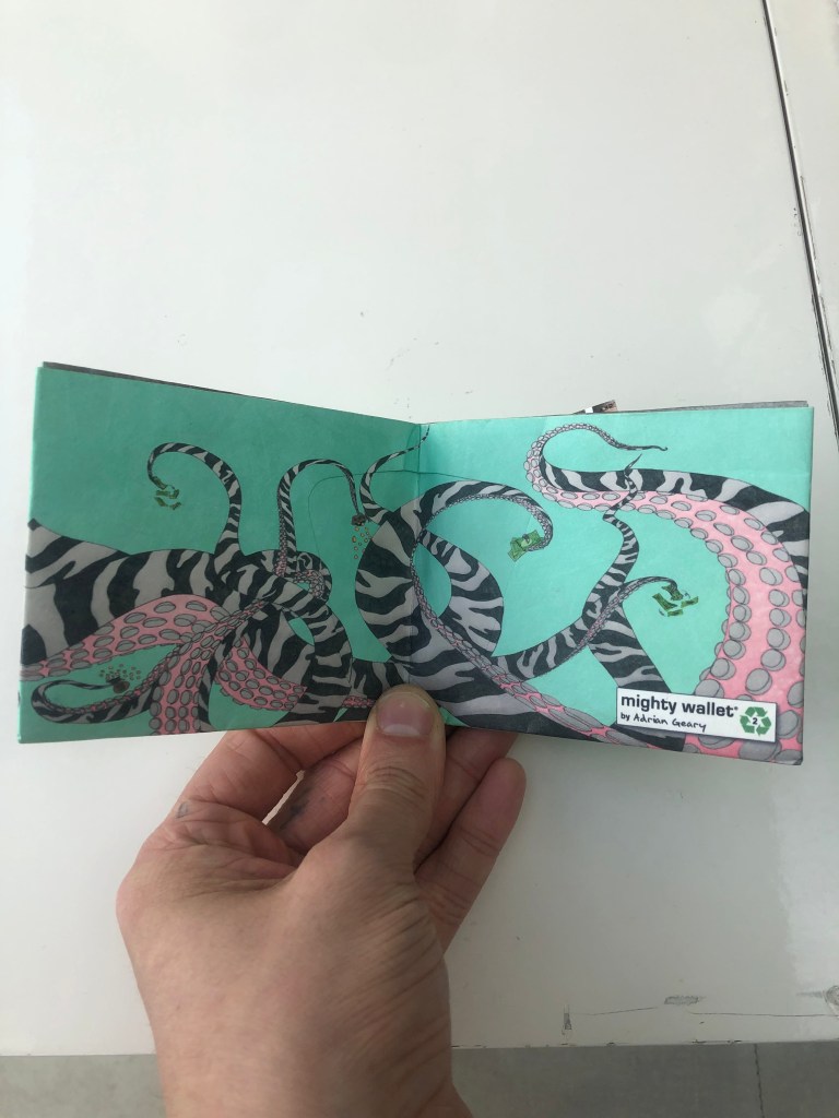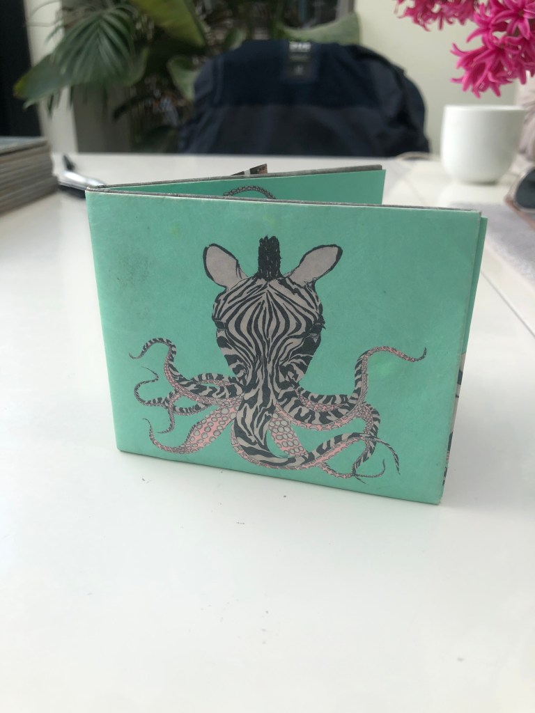 I designed a wallet called Zebropus, which was inspired by London,UK, street art and featured a Zebra with tentacles on its face. I drew each side of the design with pen on paper, then digitally coloured each of the panels. The interior spread features eight tentacles picking up money and bags of coins. I included the face on the front, and its rear on the rear, in an intentionally humourous fashion.