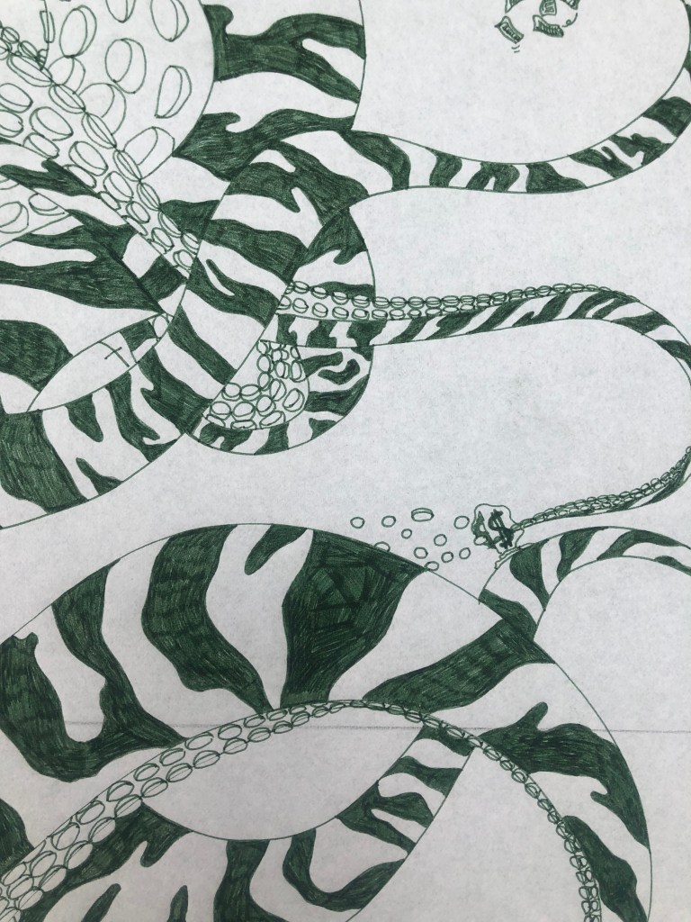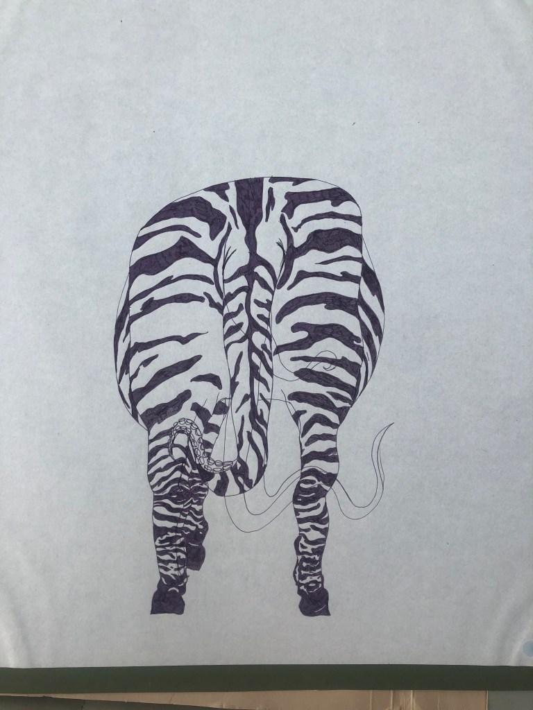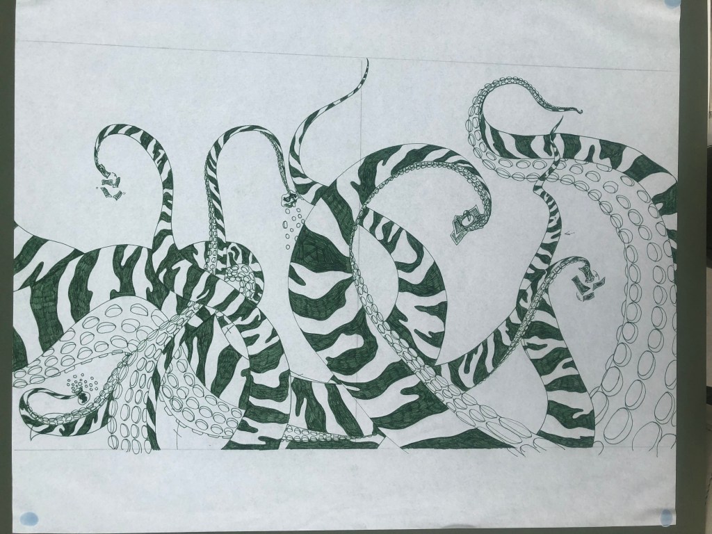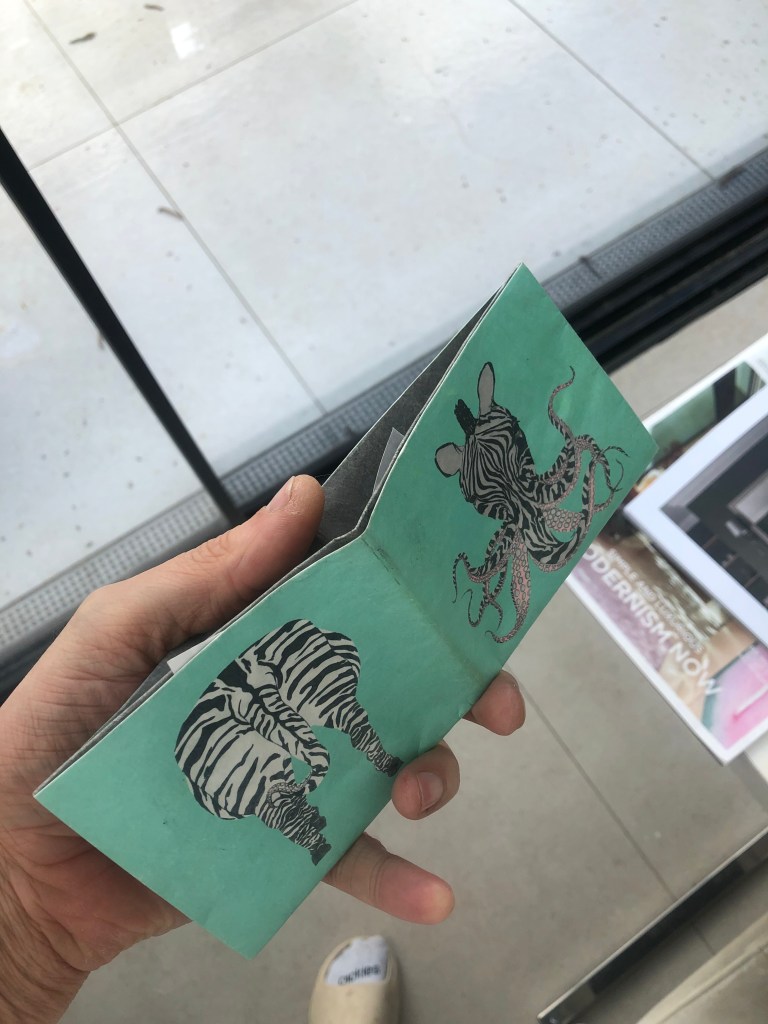 I designed a wallet called Zebropus, which was inspired by London,UK, street art and featured a Zebra with tentacles on its face. I drew each side of the design with pen on paper, then digitally coloured each of the panels. The interior spread features eight tentacles picking up money and bags of coins. I included the face on the front, and its rear on the rear, in an intentionally humourous fashion.